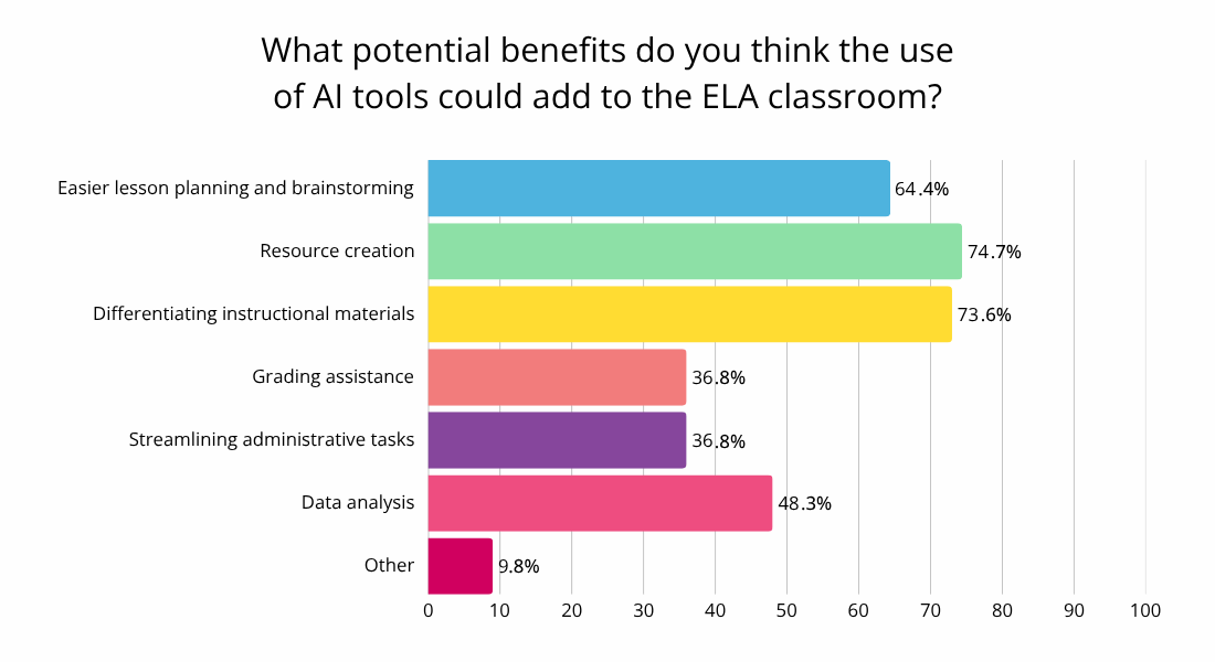 Like any tool, AI programs do have potential benefits, even if the technology itself is contentious. We presented survey respondents with a few potential ways in which AI tools could benefit the ELA classroom. Resource creation was the most popular at 74.7%, followed closely by differentiating instructional materials at 73.6%. Next were easier lesson planning and brainstorming at 64.4% and data analysis at 48.3%. Grading assistance and streamlining administrative tasks were tied at 36.8%.