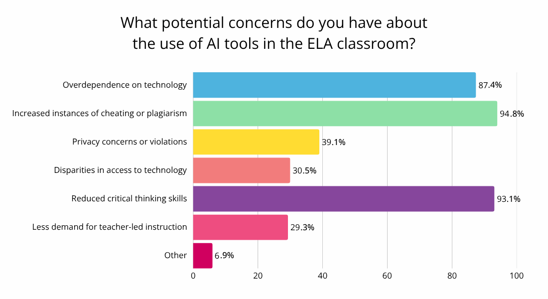 There are many valid concerns about AI in the ELA classroom. Among the given options, the most popular concern was increased instances of cheating or plagiarism at 94.8%. Reduction in critical thinking was a close second, with 93.1% of respondents choosing this answer.