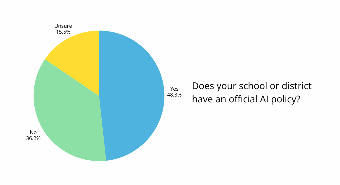 With that information in mind, we asked survey respondents if their schools or districts have official AI-use policies. Answers were mixed, with 48.3% of respondents saying there’s a policy, 36.2% saying there isn’t, and 15.5% were unsure.