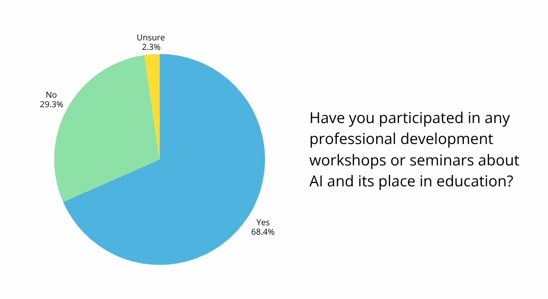 The goal of professional development (PD) workshops and seminars is to help teachers grow their teaching skills and learn about new techniques. With AI as ubiquitous as it is now, there are bound to be PD sessions on the subject taking place. When asked if they’ve participated in any PD workshops or seminars about AI and education, 68.4% of survey respondents said yes, 29.3% said no, and 2.3% weren’t sure.